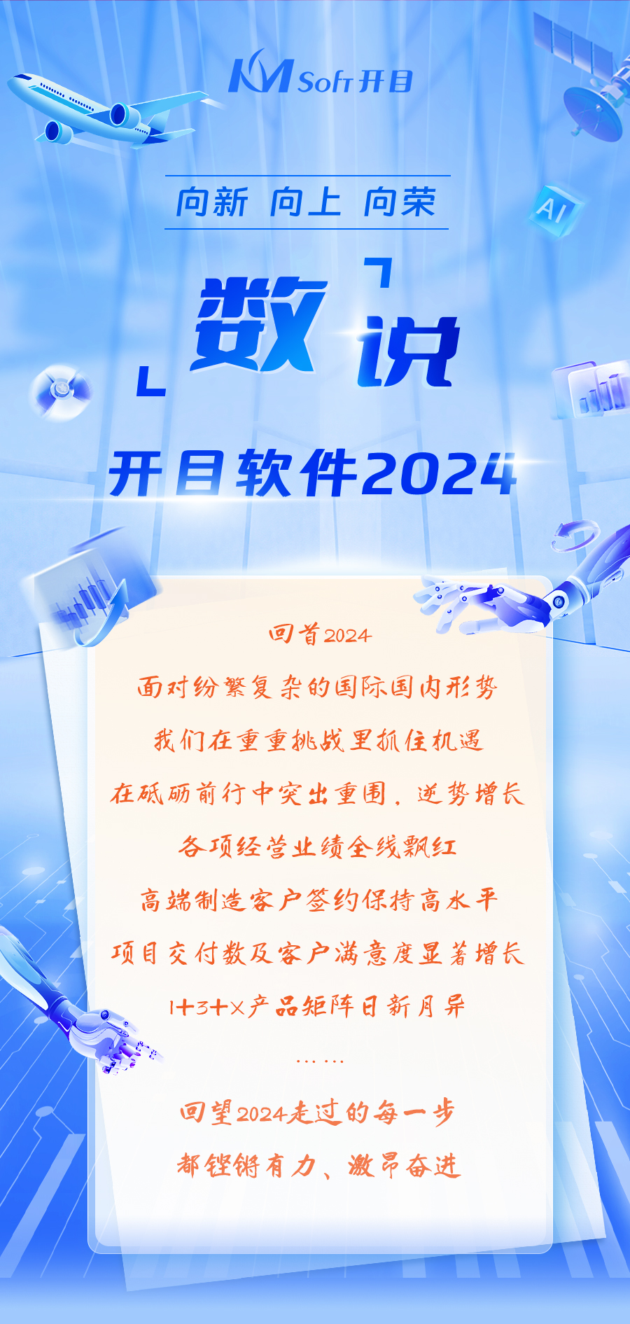 2024年,为打造高端制造数字化转型行业标杆,持续为客户数字化建设创造价值,开目重磅启动“护航行动”专项计划,高管团队深入一线、靠前指挥,为项目的高质量交付保驾护航。顺利交付了百余个数字化研发、数字化工艺、数字化制造项目,并联合客户举办了100+项目验收会,打造了众多行业示范标杆。